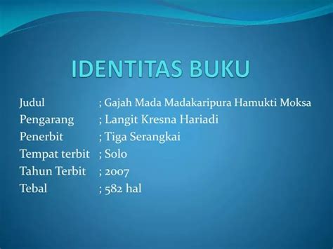 Identitas buku meliputi berbagai informasi yang terkait dengan buku tersebut, seperti judul, penulis, penerbit, dan tahun terbit. Informasi ini dapat membantu identifikasi buku secara lebih spesifik dan mempermudah dalam pencarian dan referensi. Namun, identitas buku tidak mencakup isi atau konten dari buku tersebut.